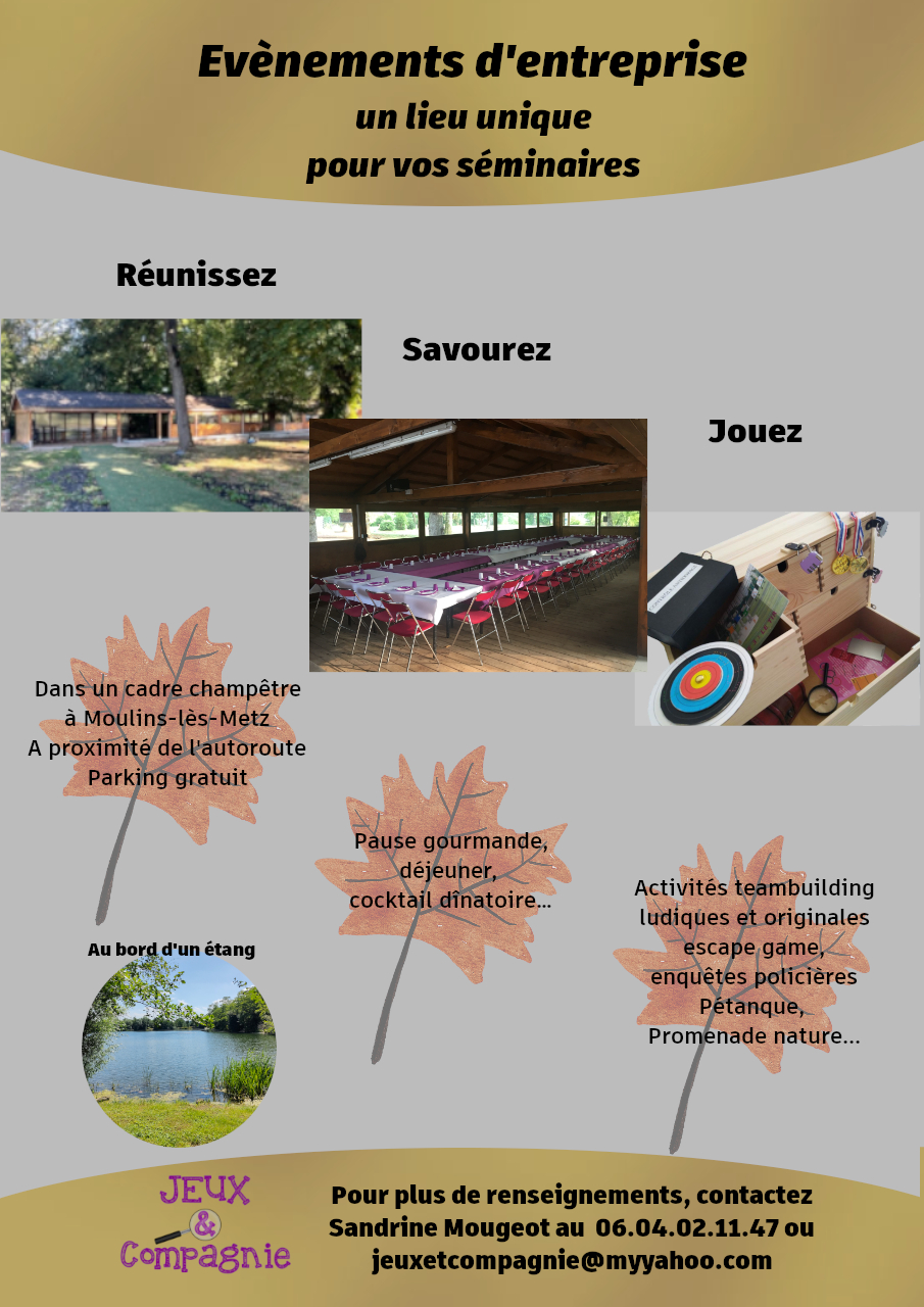 Jeux & Compagnie étudie toute demande personnalisable et s'associe à d'autres partenaires (traiteur, réservation de locaux, hébergement,...) pour vous offrir la formule la plus adaptée.